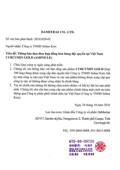 - Công ty TNHH Sohee Kim là đơn vị phân phối chính thức dòng sản phẩm Curcumin Gold ( dạng ống/tép) tại thị trường Việt Nam